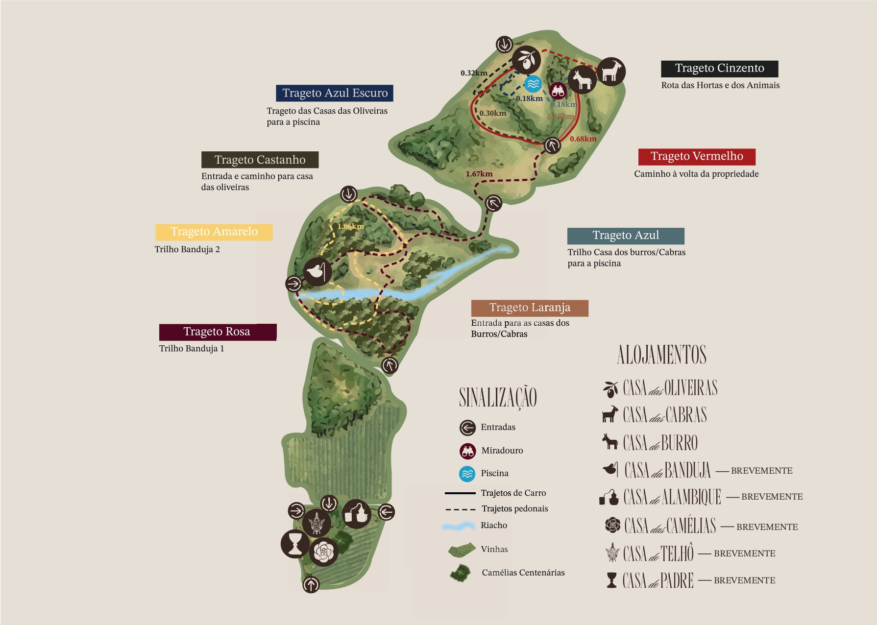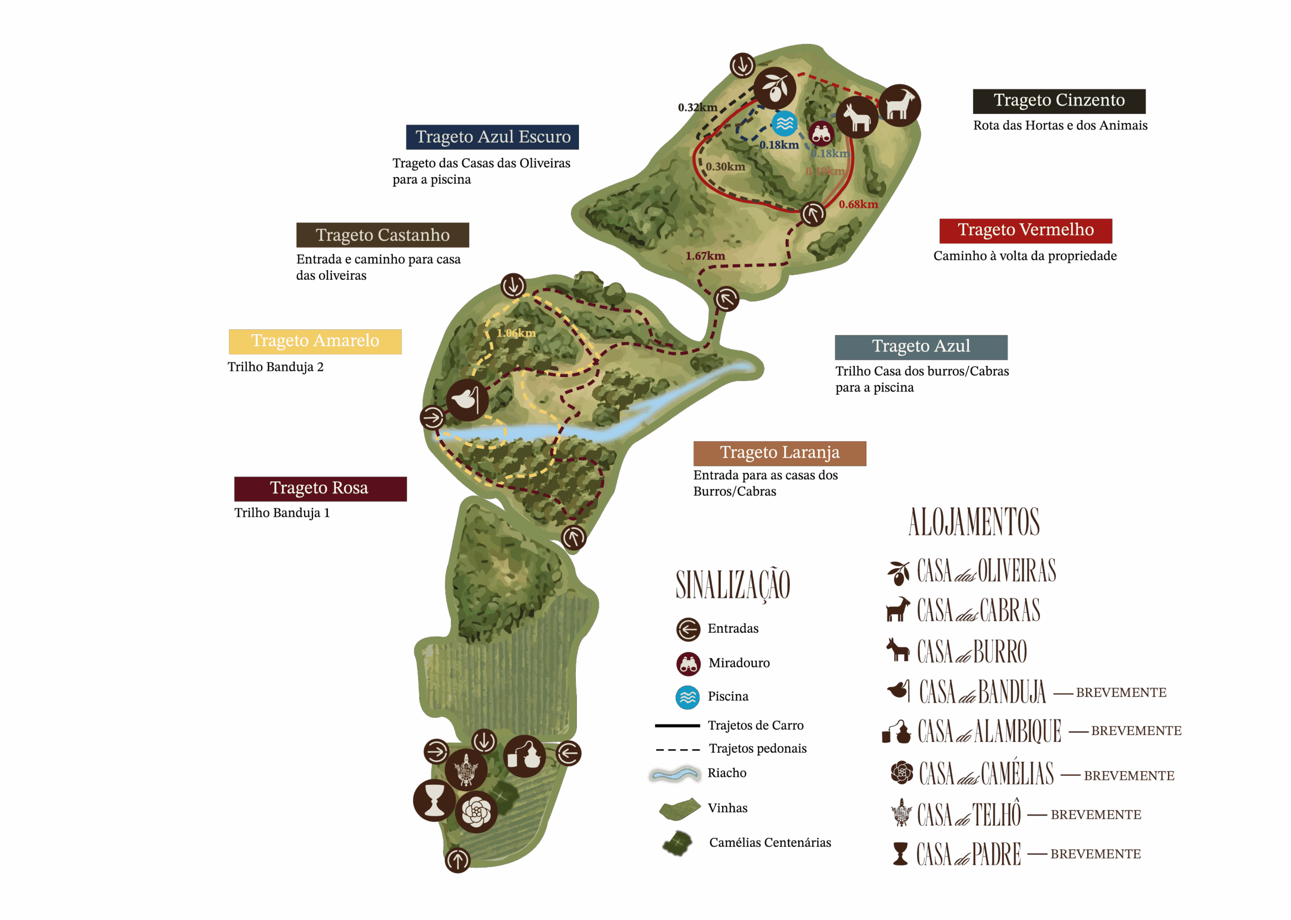 A Floresta da Banduja tem três percursos pedestres com levadas de água. Cada trilho tem o seu ritmo e o seu ponto de chegada. O mapa entregue na casa mostra os caminhos, a orientação e os pontos de referência dentro da propriedade. É só caminhar.